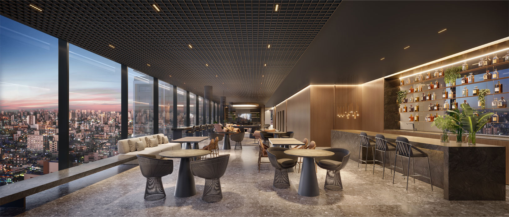 O rooftop das torres amplia a experiência com espaços de convivência internos e externos, espaço gourmet, sala multiuso, espaço fitness e vista panorâmica da cidade — atributo que agrega valor imobiliário e reforça o posicionamento premium do empreendimento.